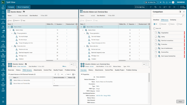 - Advanced comparison for master and variant FMEA: Teamcenter Quality 2512 introduces split, compare, and show comparison commands for side-by-side FMEA viewing, helping teams quickly identify differences and maintain consistency across variants.