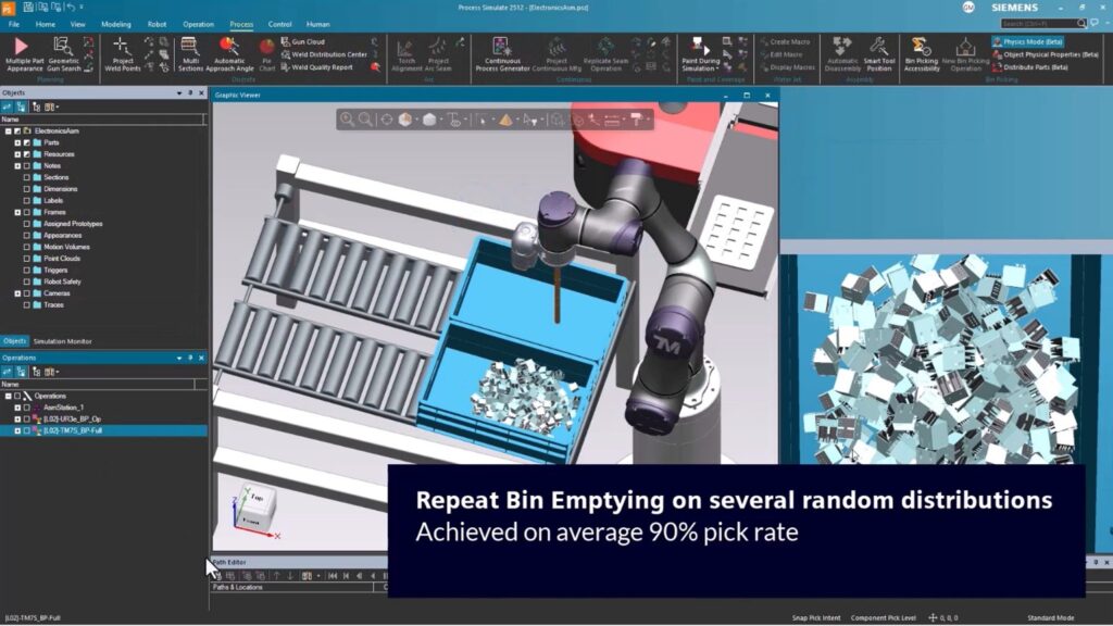 With the layout in place, the next step is ensuring robots can handle parts reliably and efficiently. In electronics assembly, bin picking and tool validation remain key challenges for reliable automation. Robots must pick parts from bins with varying orientations and densities, and grippers need to perform consistently across different components. Process Simulate provides dedicated bin picking features that, combined with physics, allow engineers to test feasibility in terms of accessibility and collision, ensuring that the robot can reach every part without interfering with surrounding equipment. By virtually validating grippers, tooling, and pick strategies with physics-enabled accuracy, teams can reduce mispicks, optimize handling, and accelerate the deployment of new tools or part variants, ultimately improving production efficiency and reliability.