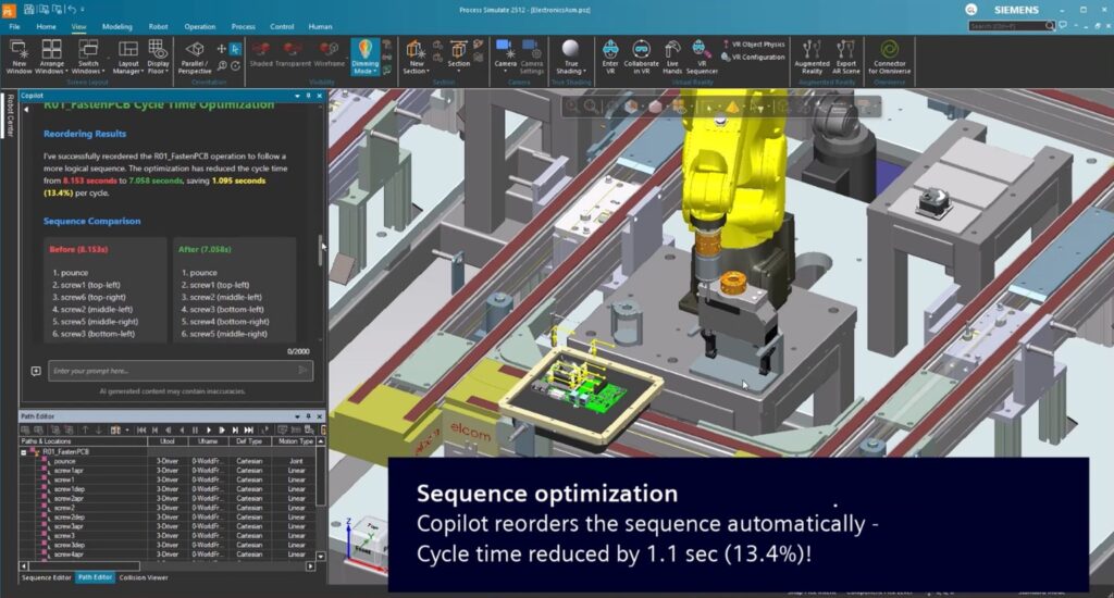 After addressing bin picking and tool validation, the focus shifts to optimizing robot motion for the rest of the assembly cell. In classic, non-random processes – such as soldering, fastening, or component placement – robots must follow efficient, collision-free paths while coordinating multiple axes and tools. Process Simulate provides a virtual environment where engineers can plan, test, and fine-tune these movements before any physical deployment. The AI Copilot feature takes this a step further by automatically suggesting optimized trajectories, identifying potential collisions, and recommending adjustments to improve cycle times and workflow efficiency. By leveraging these capabilities, teams can reduce trial-and-error on the shop floor, ensure safer and more efficient operations, and accelerate the deployment of high-performing robotic systems across the assembly line.