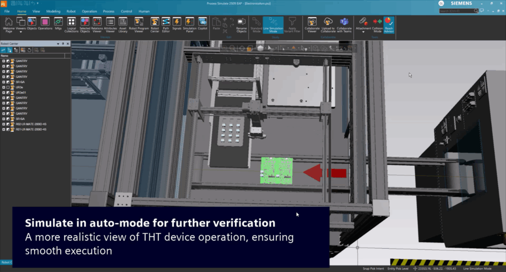 Besides robots, non-robotic devices such as THT (Through-Hole Technology) machines and surface-mount machines play a crucial role in electronics assembly. These machines have fixed motions and defined reach zones, which can create challenges in terms of mechanical interference and accessibility. Ensuring they can operate without colliding with nearby equipment or restricting the movement of other machines is essential for smooth production. Process Simulate helps engineers address these challenges by modeling the devices virtually, testing reachability, motion range, and potential collisions within the full assembly cell. By resolving interference issues early, teams can optimize machine placement, maintain efficient workflows, and reduce costly adjustments during physical setup.