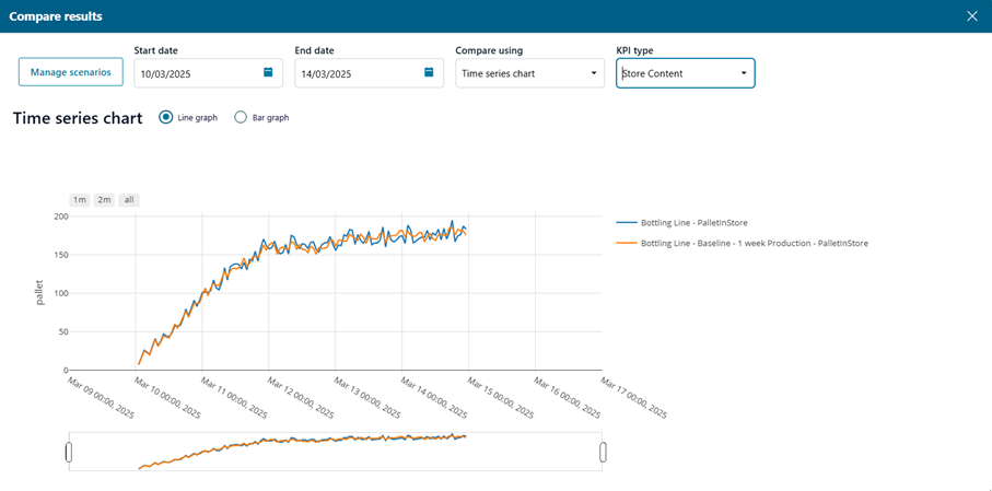 The ability to compare multiple scenarios lies at the core of OMP. Version 2509 introduces an advanced compare panel that allows users to evaluate scenarios side by side. From a table view to time series chart and OEE, users can now identify differences across key dimensions more efficiently, supporting quicker and more precise decision-making.