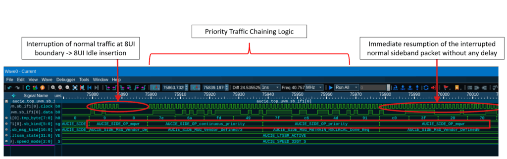 For UCIe 3.0’s new features, Avery VIP provides dedicated test capabilities. Recalibration events can be injected during live traffic to confirm uninterrupted data transfer. High-speed links are stress-tested at 48/64 GT/s under adverse conditions. PSTP handling is validated through scenarios that test PSTP pre-negotiation, mid-traffic interruption, chaining, and seamless resumption with full protocol compliance. L2SPD transitions are checked for strict compliance with timing requirements. Circular buffer behavior is verified across legal and illegal states to ensure both reliability and robustness.